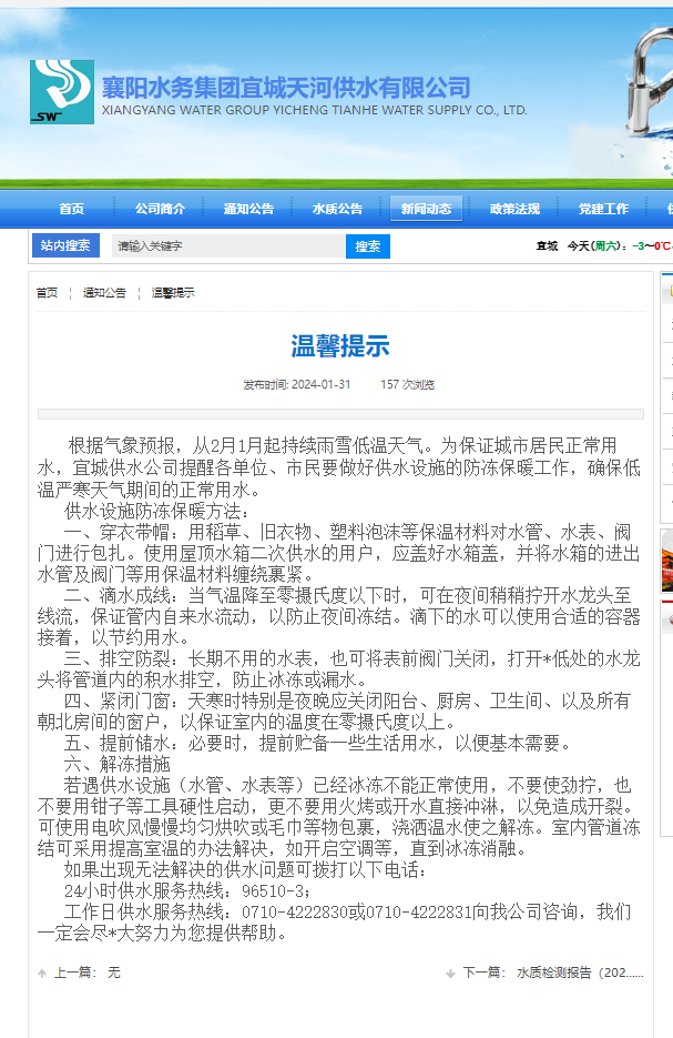 近日,我市出現(xiàn)強(qiáng)降雪天氣,極端低溫天氣易造成供水管網(wǎng)、水表、水龍頭等設(shè)施的凍損,影響市民用水安全。為保障全市供水安全穩(wěn)定,宜城天河供水公司堅持提前部署、預(yù)防為主、及時搶修原則,扎實做好寒潮及春節(jié)期間保障供水的防御和應(yīng)對措施準(zhǔn)備。